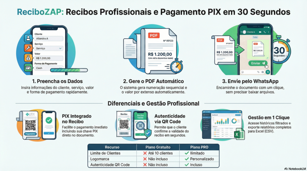 O ReciboZAP é uma plataforma digital voltada para autônomos e pequenas empresas que buscam agilizar a emissão de comprovantes de pagamento. A ferramenta permite criar documentos profissionais em poucos segundos, eliminando processos manuais e oferecendo recursos modernos como integração com PIX e autenticação via QRCode. Os usuários podem gerenciar seu histórico de vendas, gerar relatórios e enviar arquivos PDF diretamente aos clientes através do WhatsApp. O serviço opera em um modelo flexível, oferecendo uma versão gratuita para testes e um plano premium com benefícios como logomarca personalizada e armazenamento ilimitado. Dessa forma, a solução foca na praticidade e organização financeira, funcionando perfeitamente tanto em computadores quanto em dispositivos móveis.